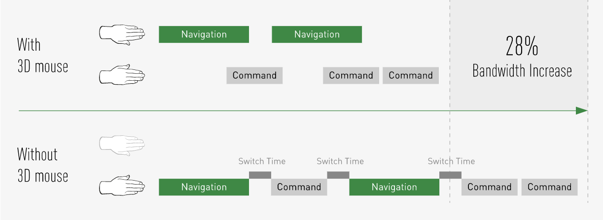การใช้ SpaceMouse ร่วมกับ เมาส์ แบบการทำงานสองมือตามภาพด้านล่าง จะทำให้เพิ่มประสิทธิภาพ และความรวดเร็วในการทำงานโดยเฉลี่ย ประมาณ 20 เปอร์เซ็นต์ เมื่อเทียบกับการทำงานแบบใช้เมาส์มือเดียวตามภาพด้านล่างส่วนบน
